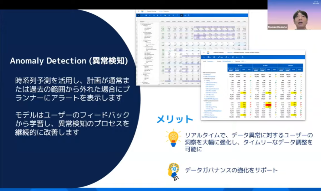 現在すでに提供されている「異常検知(Anomaly Detection)」機能は、財務データの整合性をリアルタイムで監視し、人間では見落としがちな微細な乖離をAIが即座に特定する極めて実用的なソリューションです。この機能の実装により、経営企画部門は膨大なExcelシートの突き合わせといった低付加価値業務から完全に解放され、AIが指し示す「真に検討すべき課題」の分析と解決に、最初から全エネルギーを投入できる健全な組織体制を構築できます。