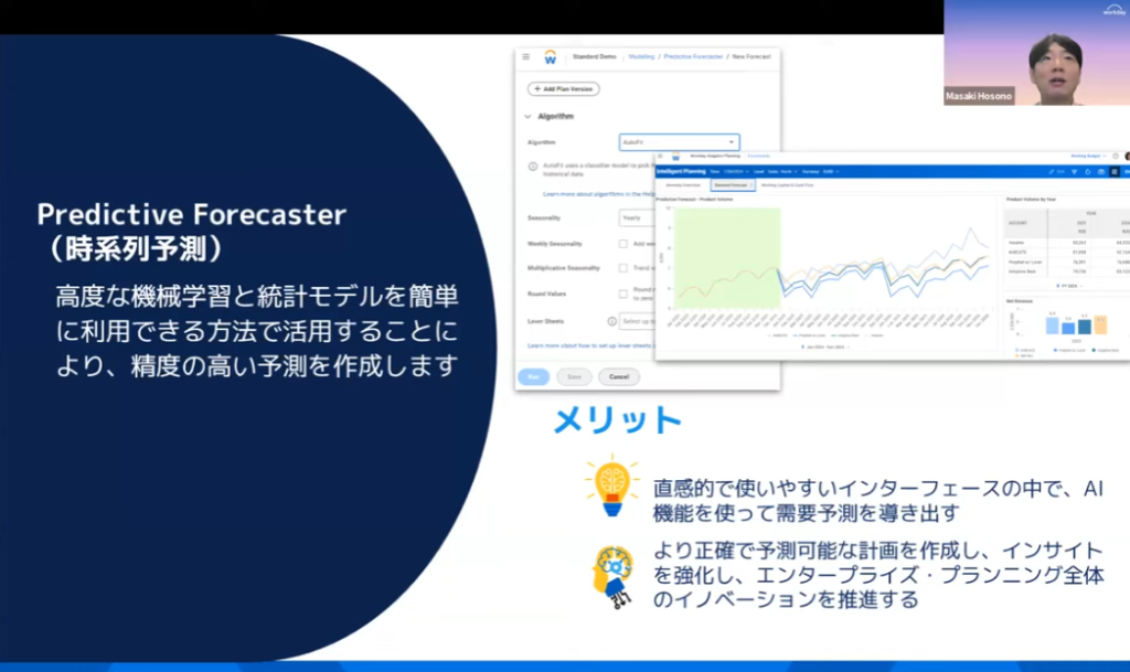 『プレディクティブ・フォーキャスター』は、過去の実績から将来の予算見込みを自動生成する時系列予測機能です。製品別や地域別といった任意の切り口で、AIが複数の予測シナリオを瞬時に描き出します。