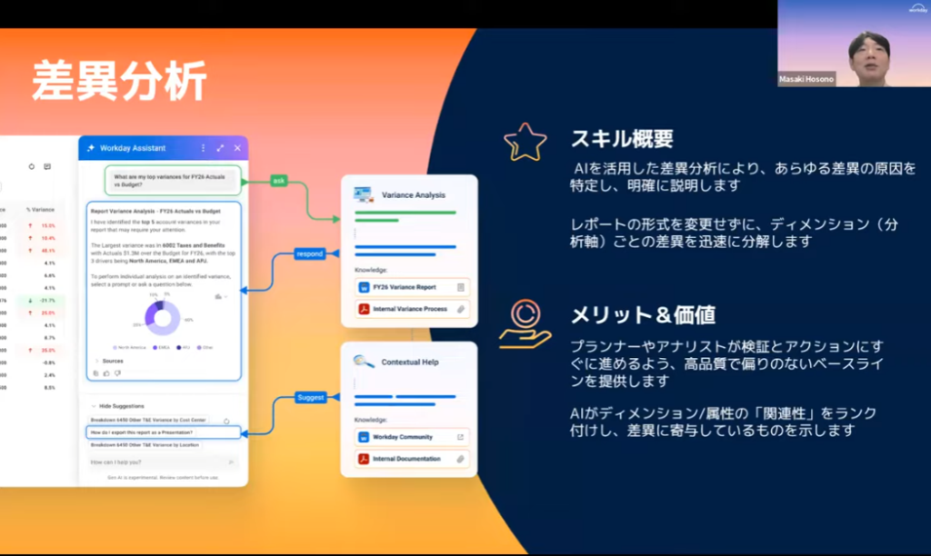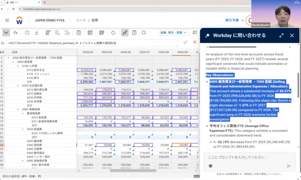 AI分析エージェント「Ask Workday」の導入は、財務データの利活用において「対話型プロンプト」という、これまでにない直感的な操作エクスペリエンスを経営企画にもたらします。売上の増減要因を探る際も、製品別、地域別、あるいは取引先別といった複雑なディメンションをAIが縦横無尽に探索し、人間が気づきにくい潜在的なインサイトや相関関係を、即座に視覚化されたレポートと共に提示してくれます。