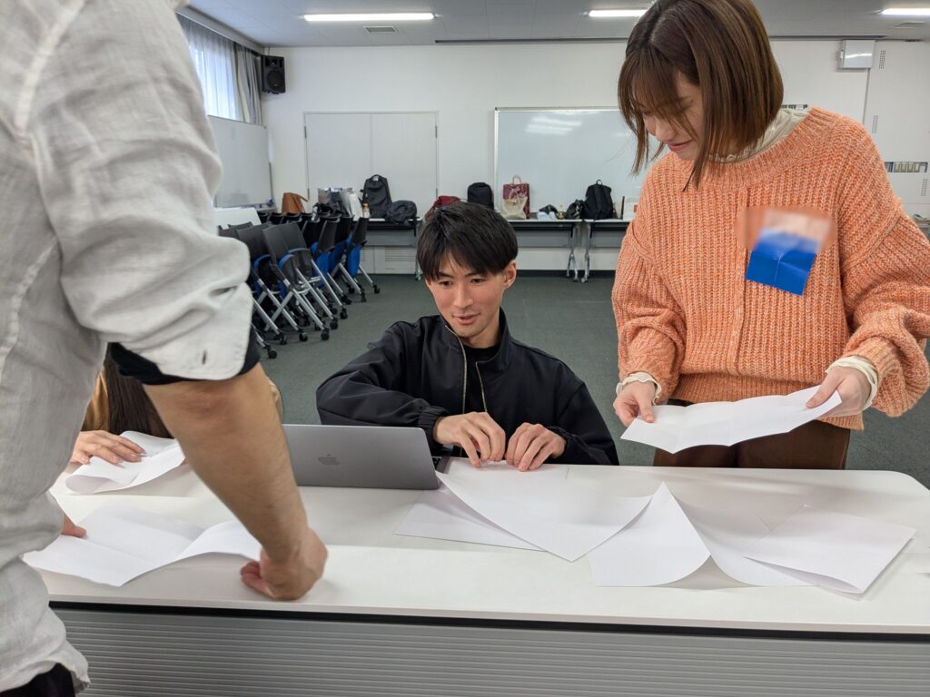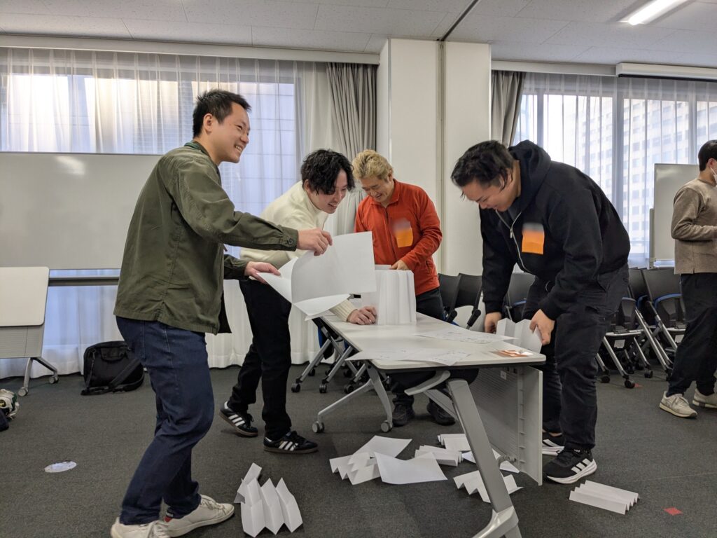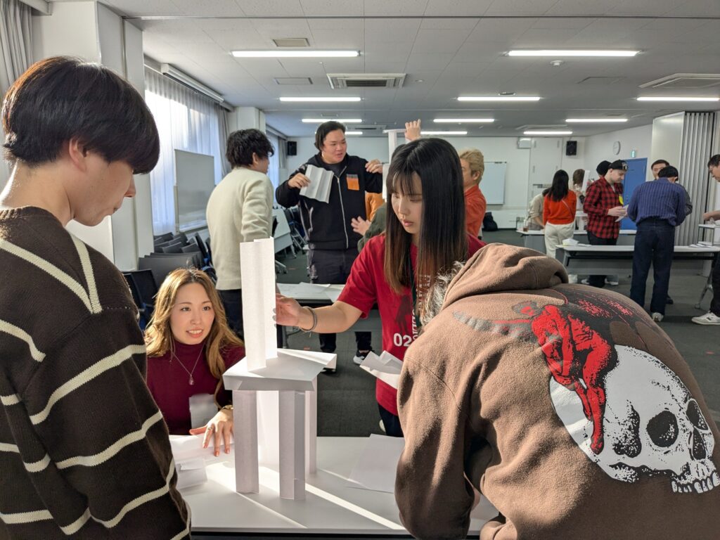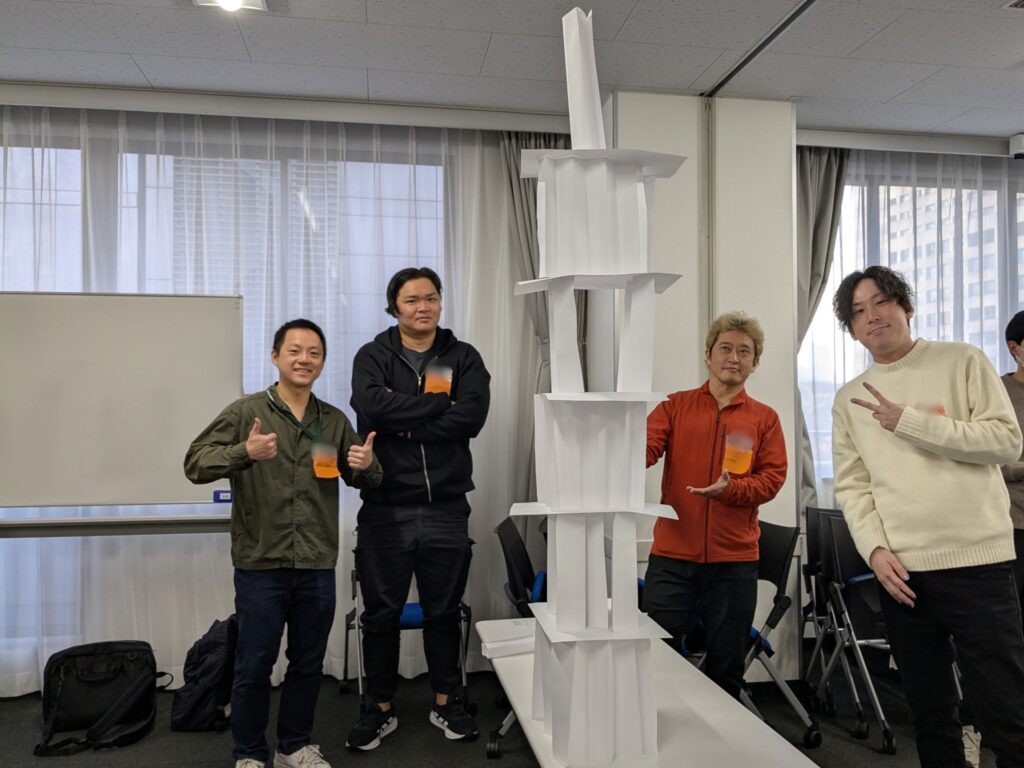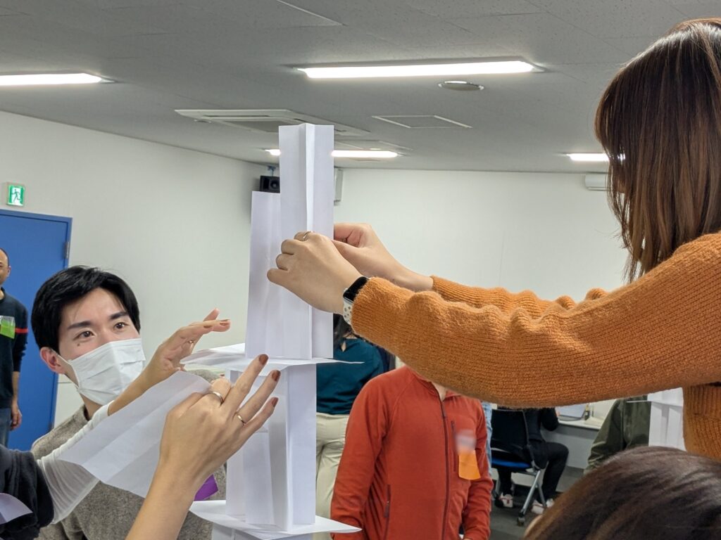 各チームに同じ枚数配られたA4の紙を、制限時間内にいかに高く積み上げられるかで競います。
