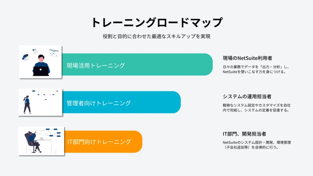 現場での日常的な活用から、システム全体の管理・設計まで、必要なスキルを段階的に習得し、NetSuiteの価値を最大化します。